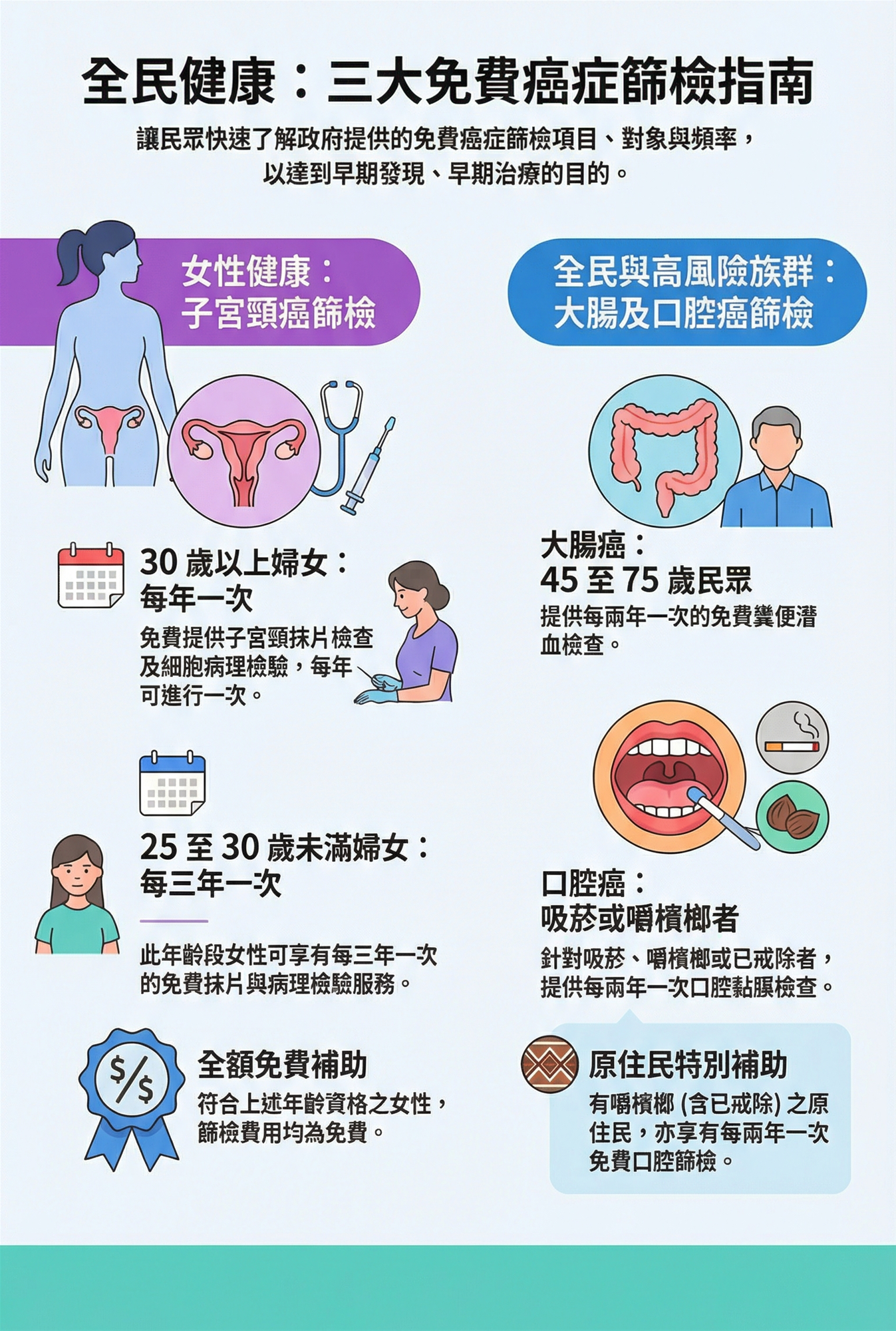| 35歲、45歲及65歲女性 | 婦女人類乳突病毒 | 當年一次 | ||