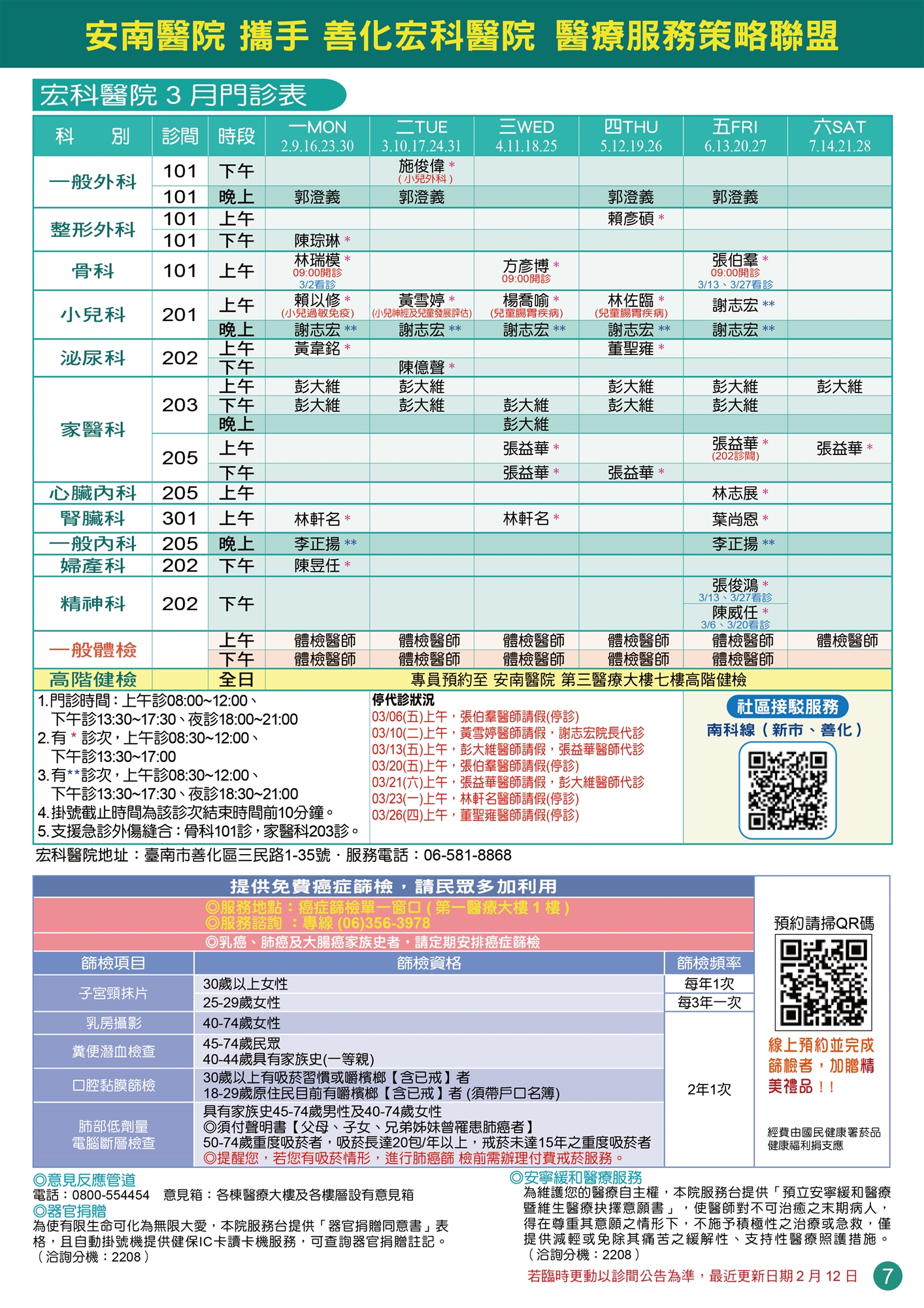 宏科醫院115年3月門診時刻表