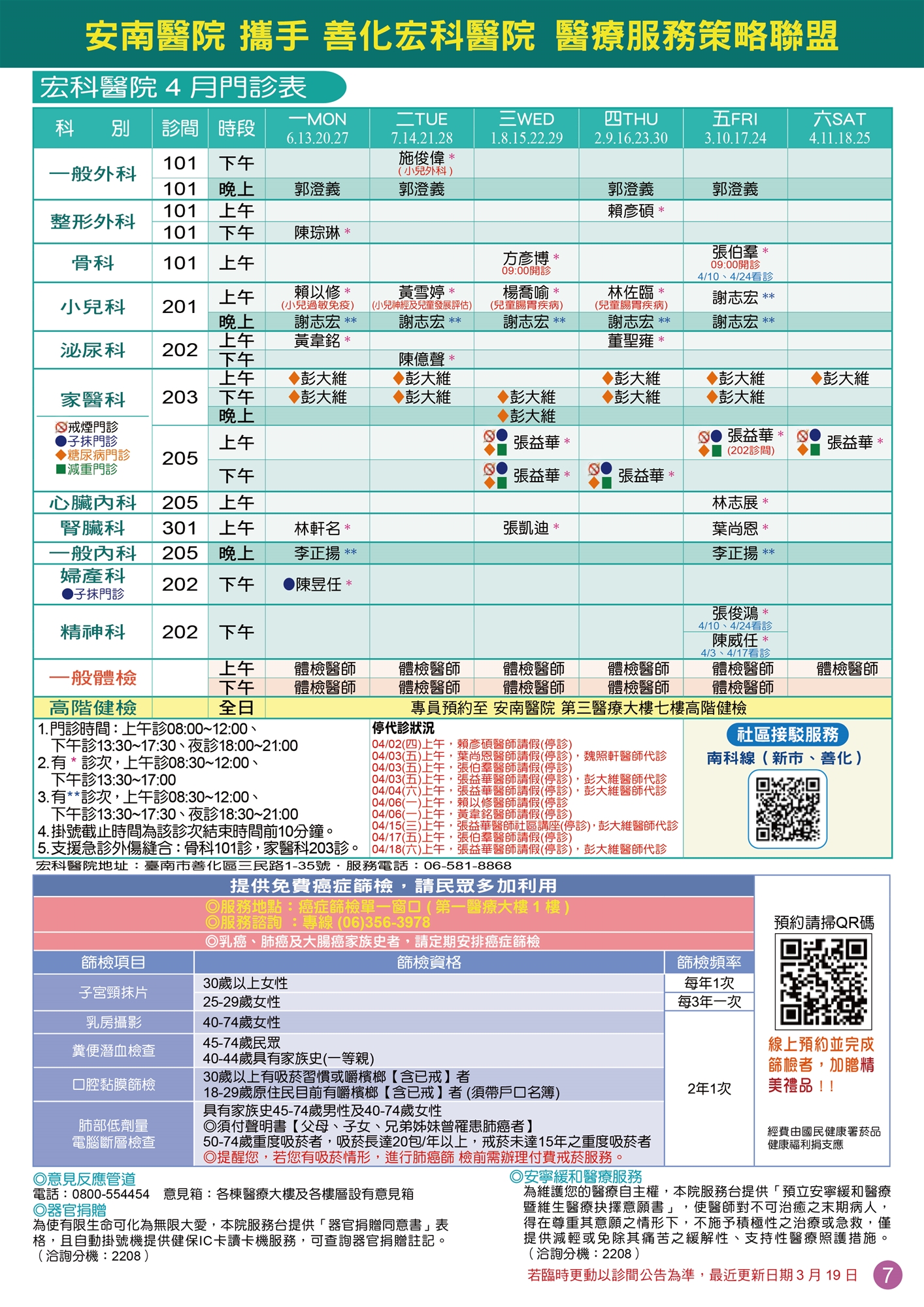 宏科醫院115年4月門診時刻表